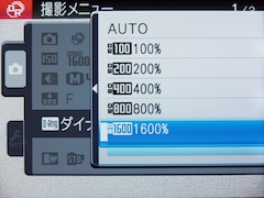 | EXRモードが「ダイナミックレンジ優先」の場合、最大1,600%までのダイナミックレンジ設定が可能になる(他モードでは400%まで)。なお、フィルムシミュレーションをVelviaやASTIAに設定すると、800%と1,600%は設定できなくなる |