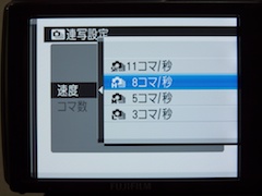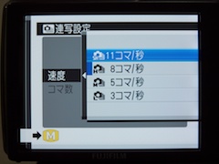 | 最高画素のL(1,600万画素)で設定できるのは「8コマ/秒」まで。「11コマ/秒」が設定できるのはM(800万画素)以下となる | |