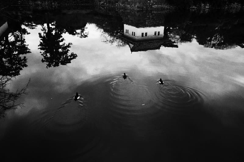 お堀に目を向けると、私から逃れるように水鳥たちが泳いでいました。イメージコントロールは[グレイニー]と見比べた結果、水面の様子がより印象的に感じられた[ハイコントラスト]を選びました。粒状感が効いていて、高感度フィルムによる銀塩写真ライクな調子である点も決め手となりました。
