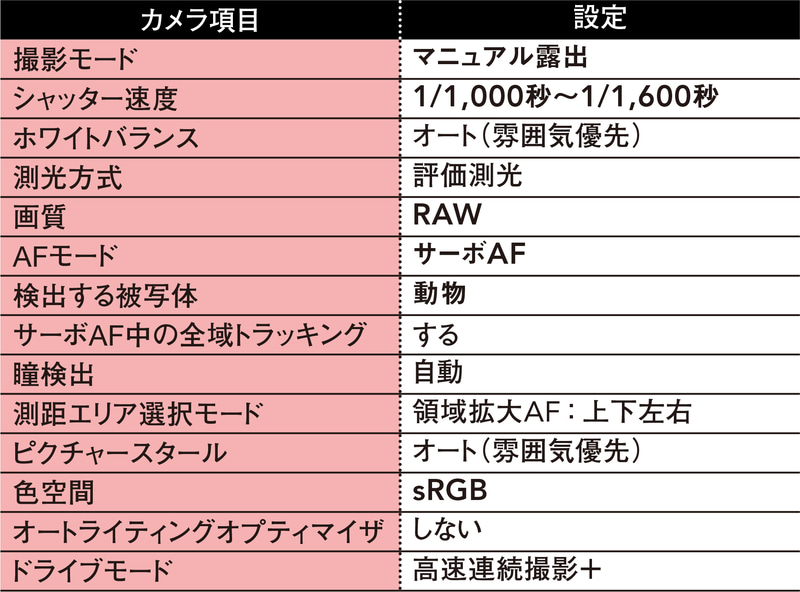 色調に関してはキヤノンのオート設定が最も被写体になじむと判断し、ピクチャースタイルおよびホワイトバランスはオートを採用。AFは領域拡大AF(上下左右)にサーボAFを組み合わせ、ピントをカメラに委ねることで、猫の瞳への合焦率を上げている。