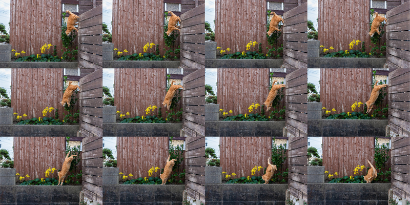 撮影時は常に、約40コマ/秒の「高速連続撮影+」を使っている。ジャンプや着地のシーン、小競り合いなど、猫の動きは速く目視では追いきれないことが多いが、そんなときにこの連写速度が頼りになる。