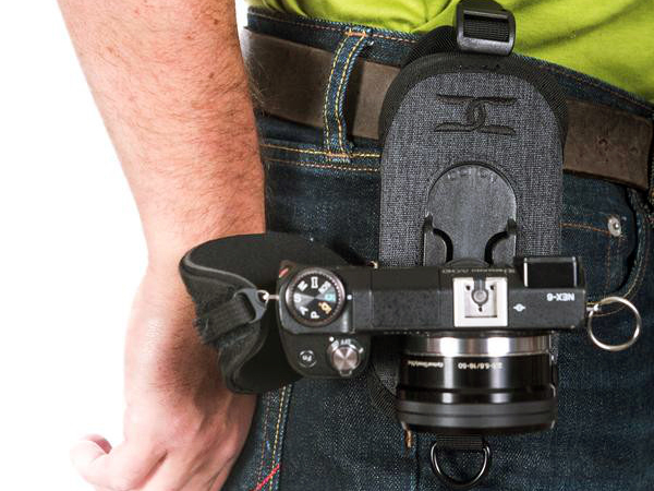 一眼レフカメラを腰ベルトに吊り下げる「カメラホルダー」