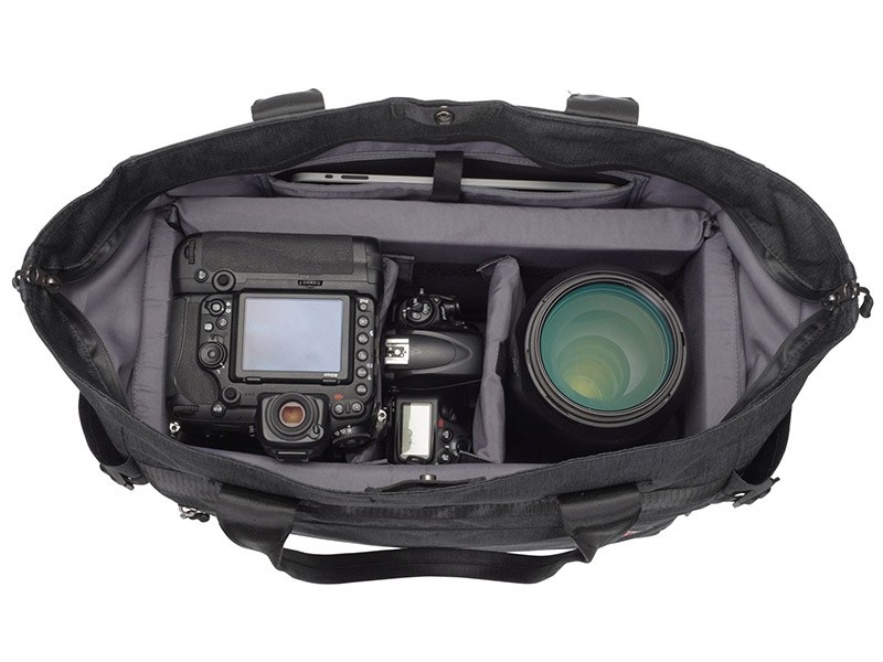 上と下、2つの開口部を持つ大型カメラバッグ