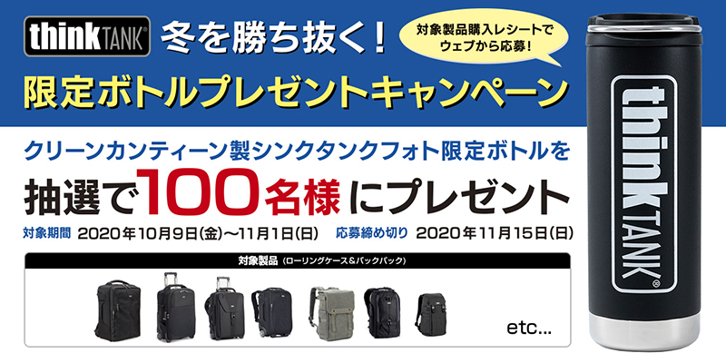 銀一オンラインショップ、対象のシンクタンクフォト製品購入で「TEAM LUKE × thinkTANK ダブルネームボトル」を進呈