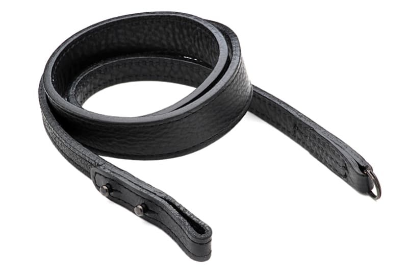 カメラマン萩庭桂太氏発案のレザー製ハンドストラップ「HAGINIWA-1」。2つの穴で巻き付け方を調整