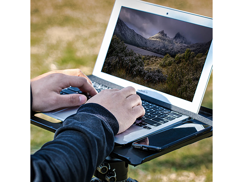 Leofoto、三脚やライトスタンドを作業台にできる「ノートPC用トレイ」。1.2万円