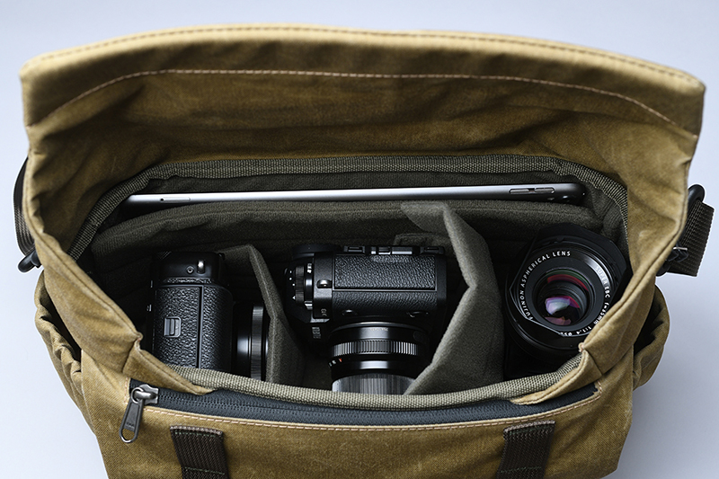 ヴォータンクラフト、一眼レフ+レンズ2~3本を収納できるビンテージ風バッグ「スカウト」。グリーンとブラックの2色