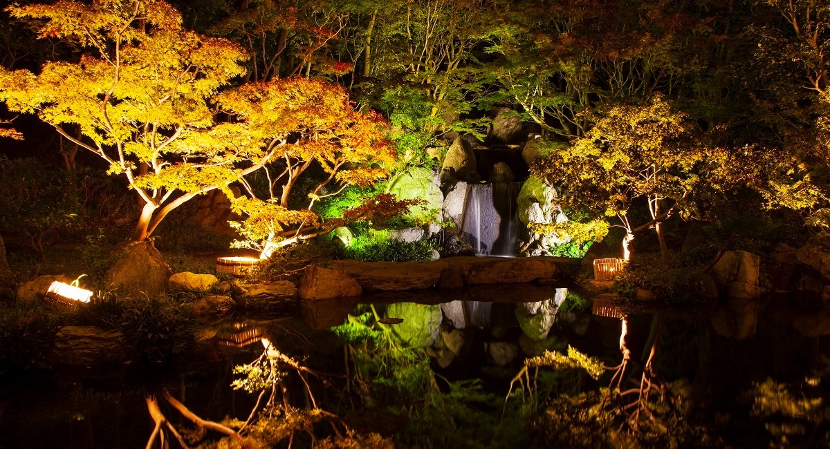 日本庭園の水鏡に映る「逆さ紅葉」が楽しめるライトアップ