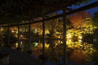 日本庭園の水鏡に映る「逆さ紅葉」が楽しめるライトアップ
