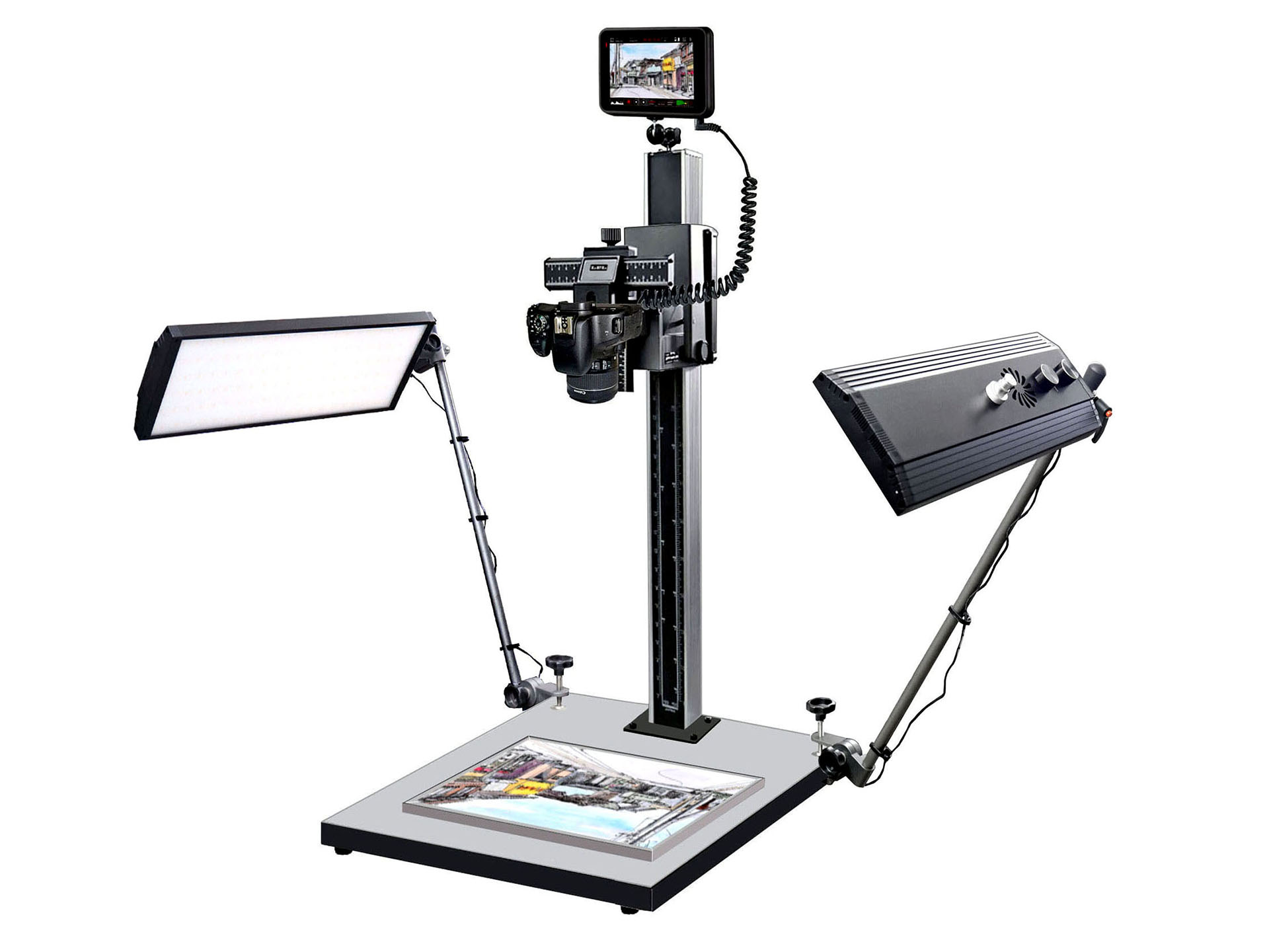 大型LEDライトでムラなく照射 俯瞰撮影のための「デジタルデータスタンド」(3/4)