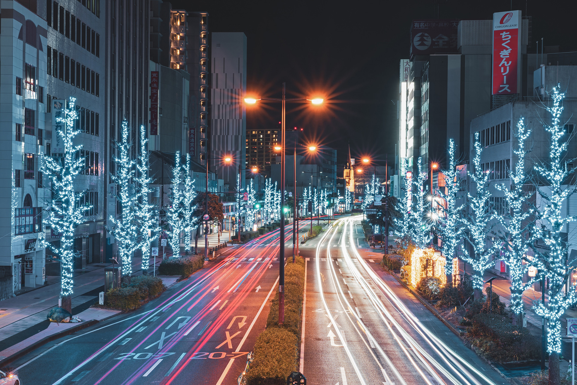 くるめ光の祭典「ほとめきファンタジー」。青い光で久留米の街を彩る