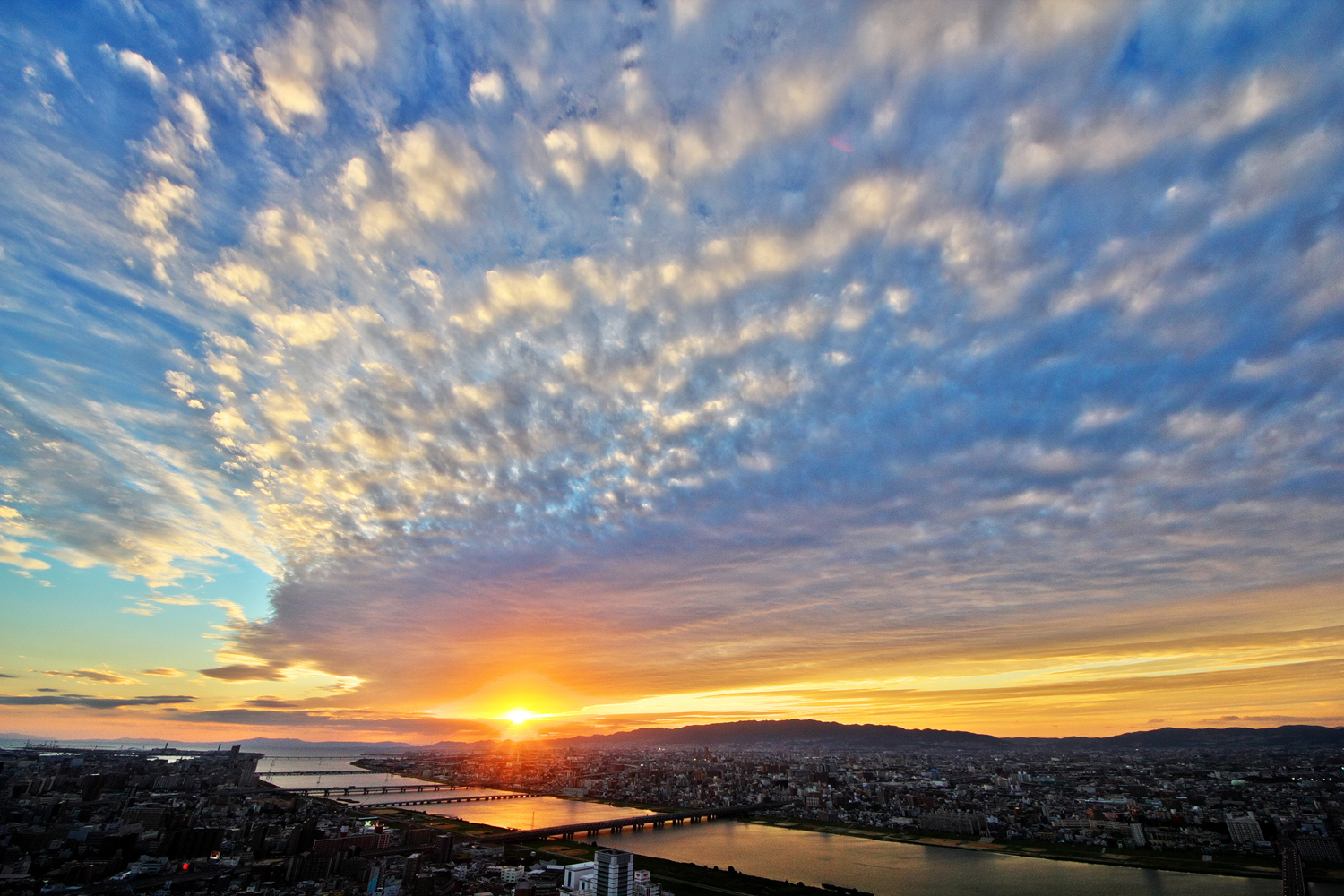 明石海峡大橋の真ん中に沈む夕陽…梅田スカイビルが見頃予測を発表
