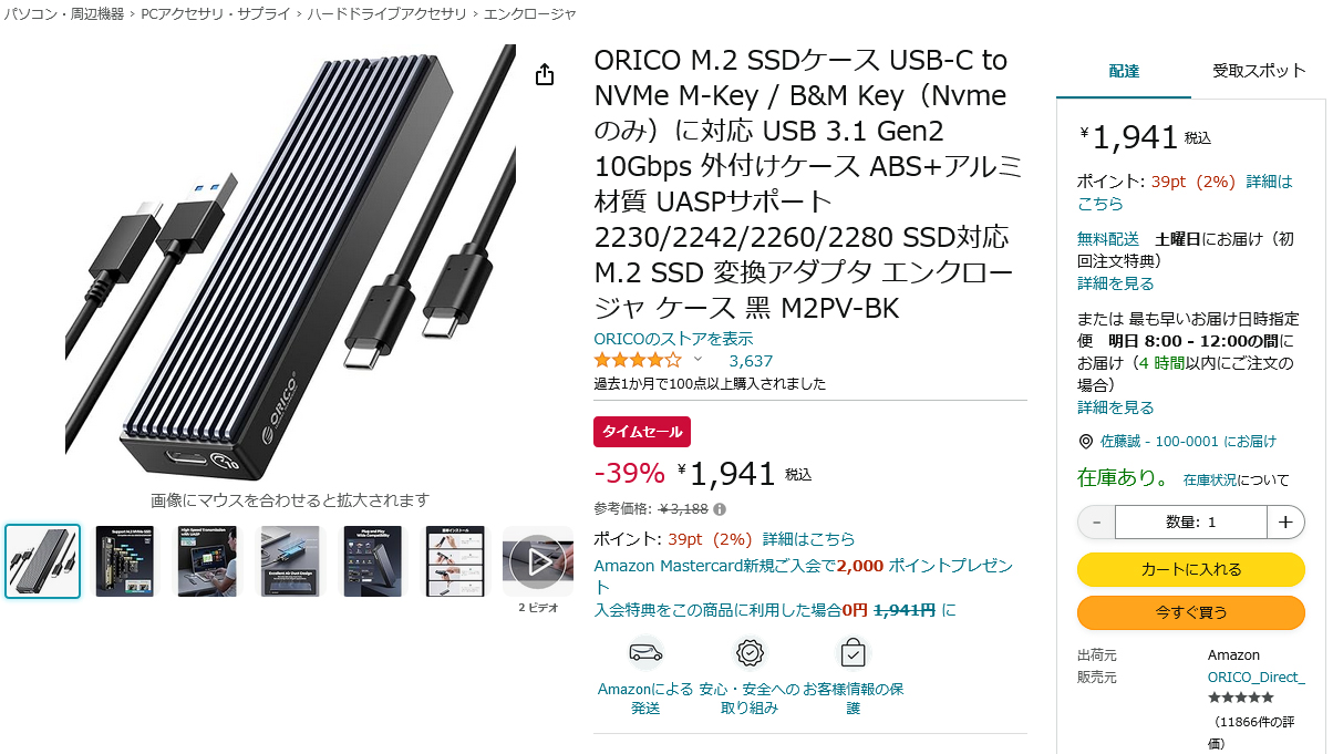 ORICOの「M.2 SSD」→「USB Type-C 3.1 Gen2」変換ケースが39%OFF