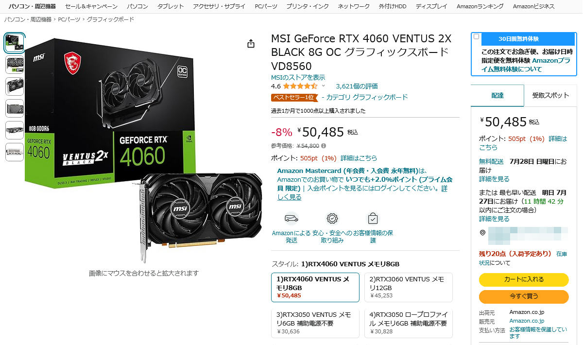 MSIのグラフィックスボード「GeForce RTX 4060 VENTUS 2X BLACK 8G OC」が8%OFF