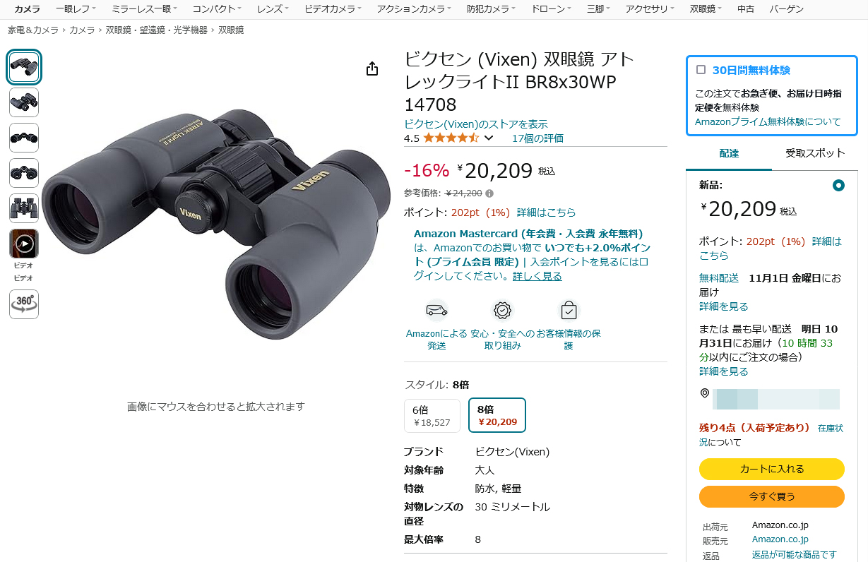 ビクセンのハイアイポイント8倍双眼鏡「アトレックライトII」が16%OFF