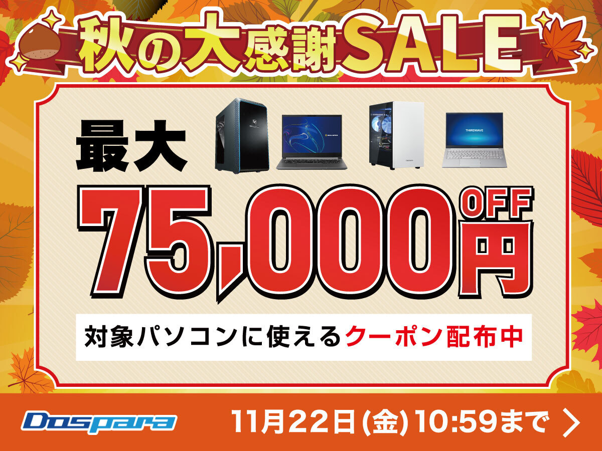 ドスパラ、クリエイターモデルも対象の最大7万5,000円引き「秋の大感謝SALE」