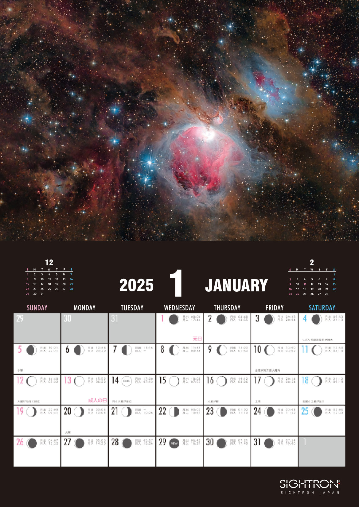 月の出入り時間や天文現象の情報がわかる壁掛けカレンダー
