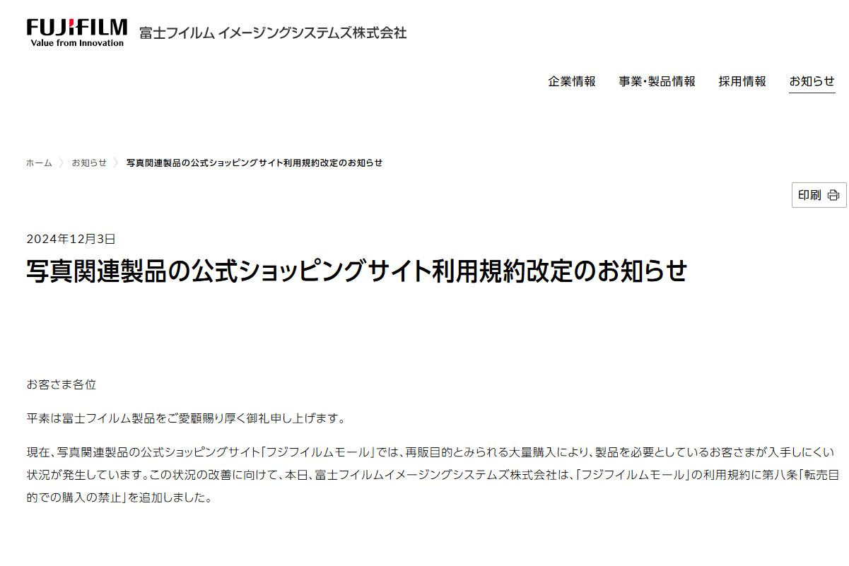 フジフイルムモールが利用規約改定で「転売目的での購入」を禁止に