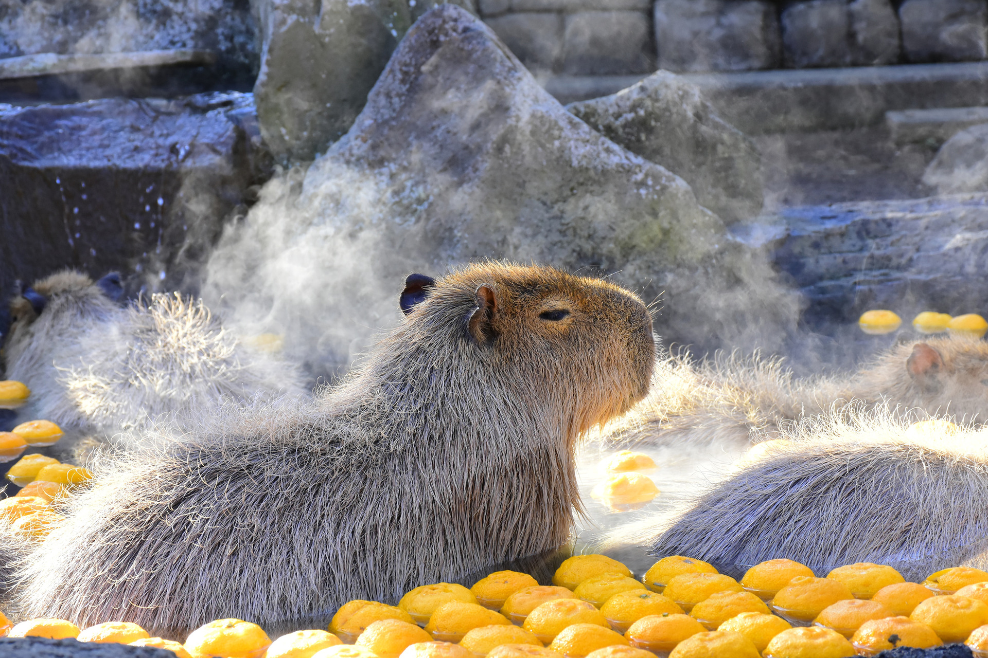 伊豆シャボテン動物公園、カピバラたちが今年もゆず湯でポカポカに