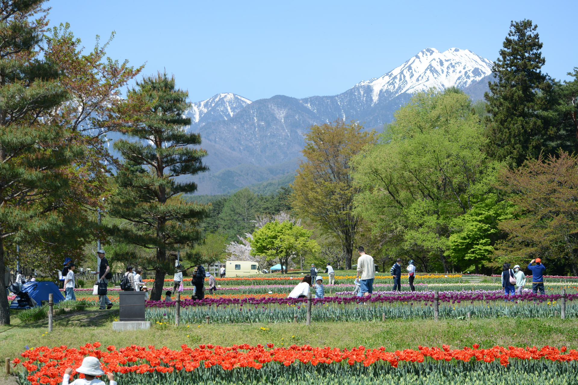残雪の北アルプスを背景に…国営アルプスあづみの公園でチューリップと菜の花が見頃に