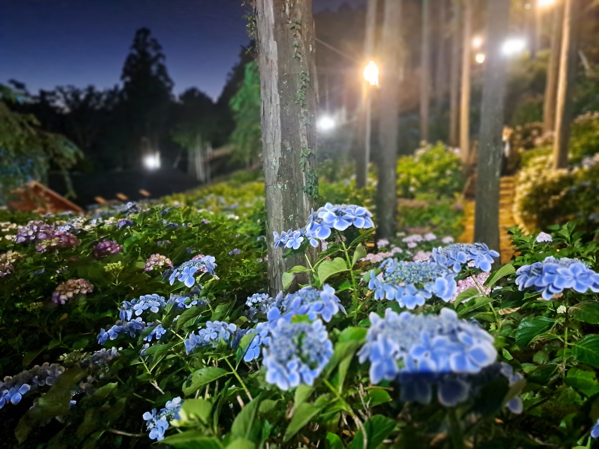 三島スカイウォークを渡った先にアジサイが咲き誇る。幻想的な夜間ライトアップも