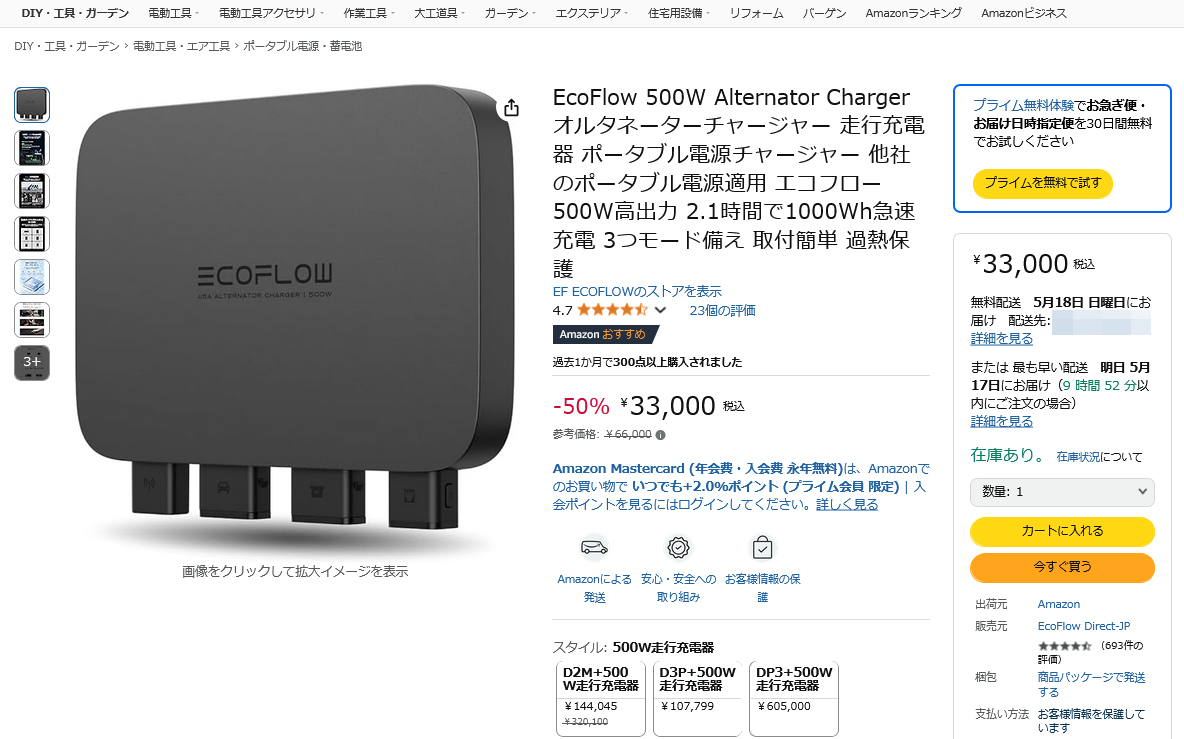 EcoFlowの500W走行充電器が50%OFFでセール中