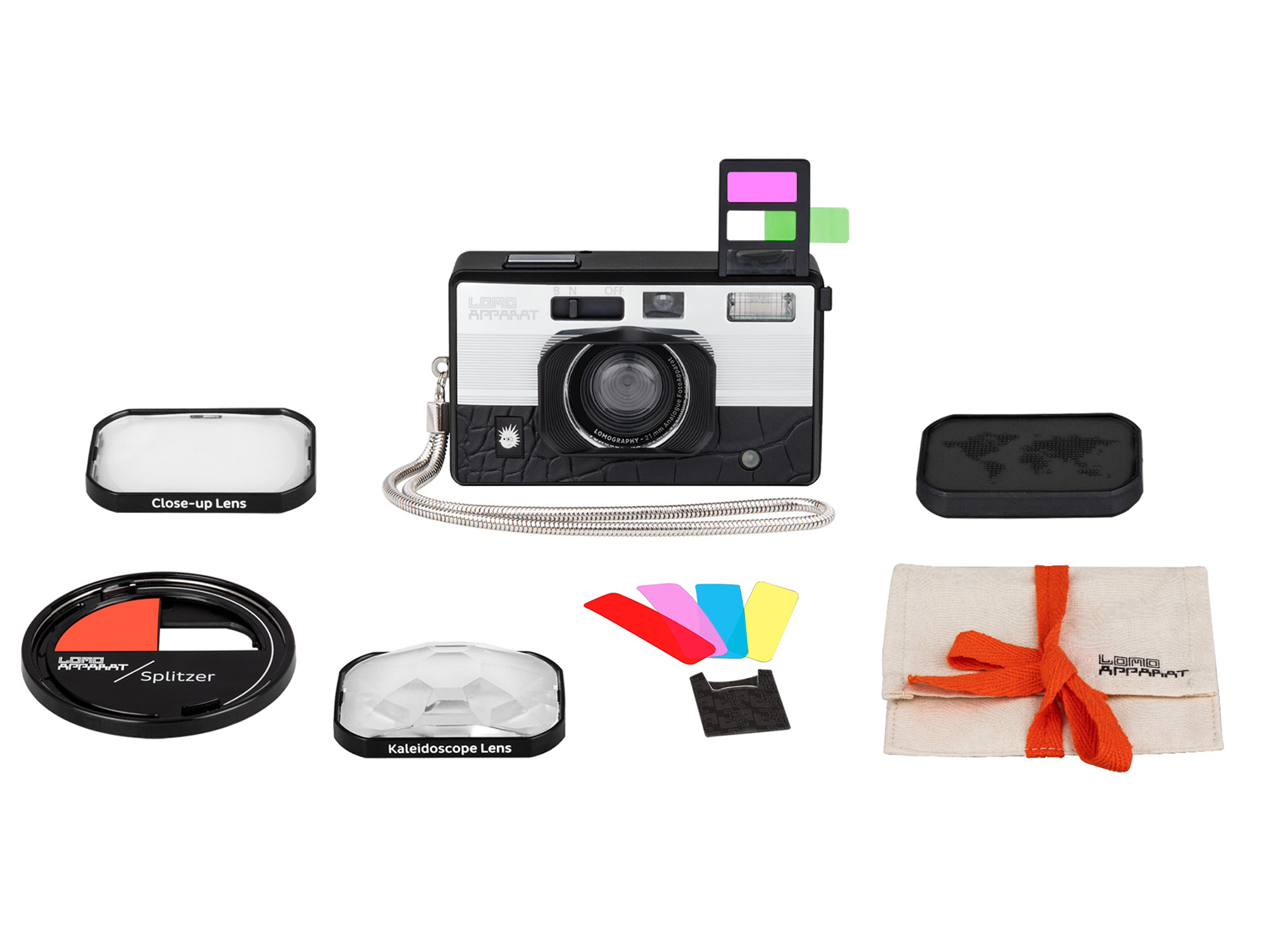 ロモグラフィー、21mmレンズ搭載のフィルムカメラ「LomoApparat」。フラッシュ用カラーフィルター内蔵