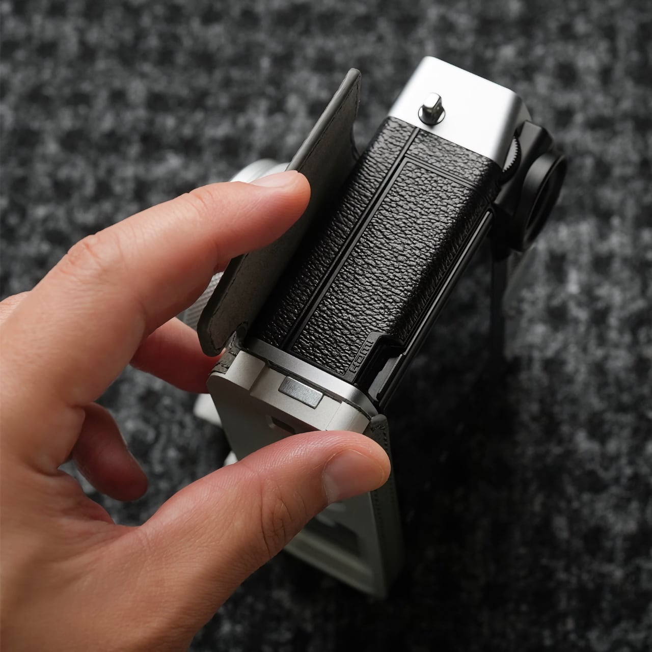 金属製グリップを備えた「X100VI」「D-LUX8」用の本革ボディケース