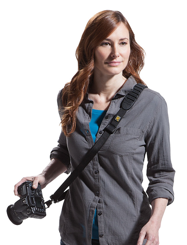 カメラを構えると伸びる斜め掛けストラップ